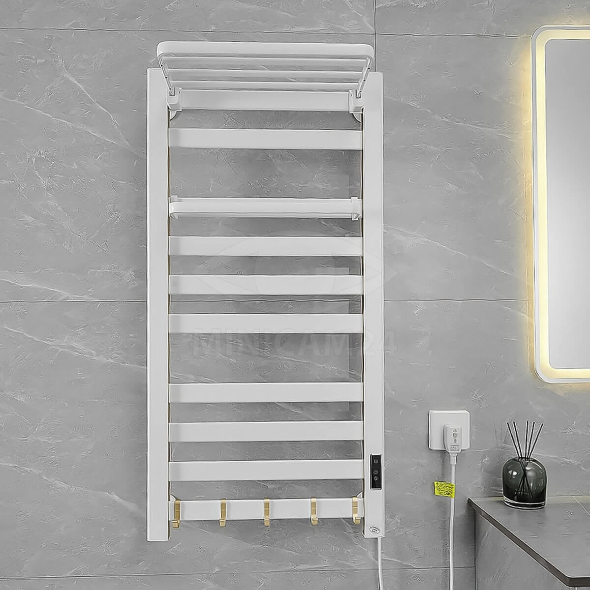 Полотенцесушитель электрический Loder 49*96 см с вешалкой - это стильное и функциональное решение для вашей ванной комнаты. Размеры составляют 480 мм (ширина) х 960 мм (высота) х 220 мм (полка) х 100 мм (от стены). Он имеет степень водонепроницаемости IPX4 и может быть подключен справа. Длина шнура питания составляет 150 см. Вы можете регулировать температуру от 35 ℃ до 60 ℃. Гарантируется безопасность использования благодаря замкам безопасности для детей и постоянной температуре.